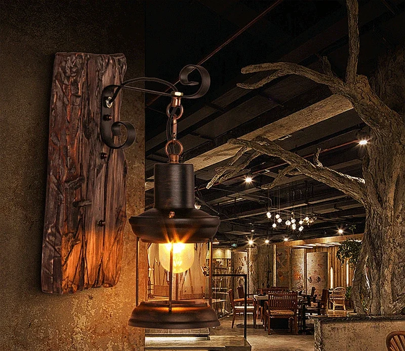 Outdoor Antique LED Loft Wall Lamp Wood Glass Restaurant Cafe Bar Sconces Vintage Industrial Retro Wall Sconce for Bedroom